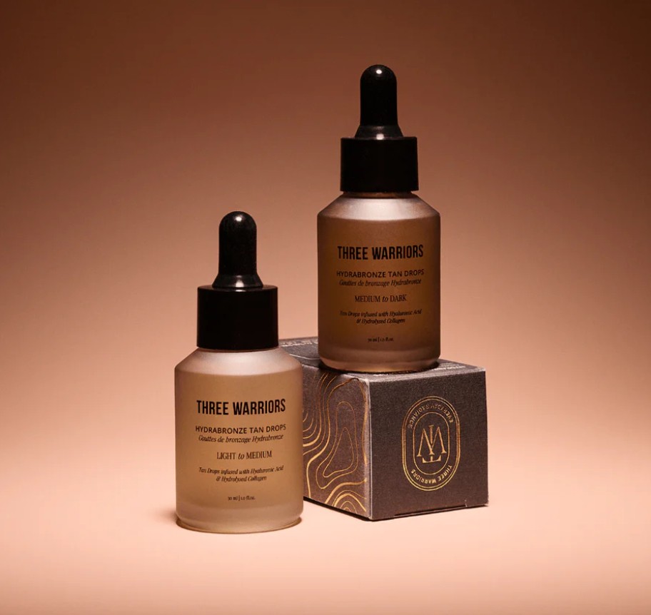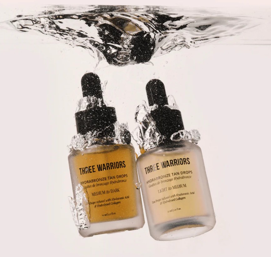 Three Warriors Hydrabronze Face Tan Drops. These easy-to-use drops blend effortlessly with your favourite moisturiser or serum, delivering deep hydration while giving you a golden glow that lasts for days.